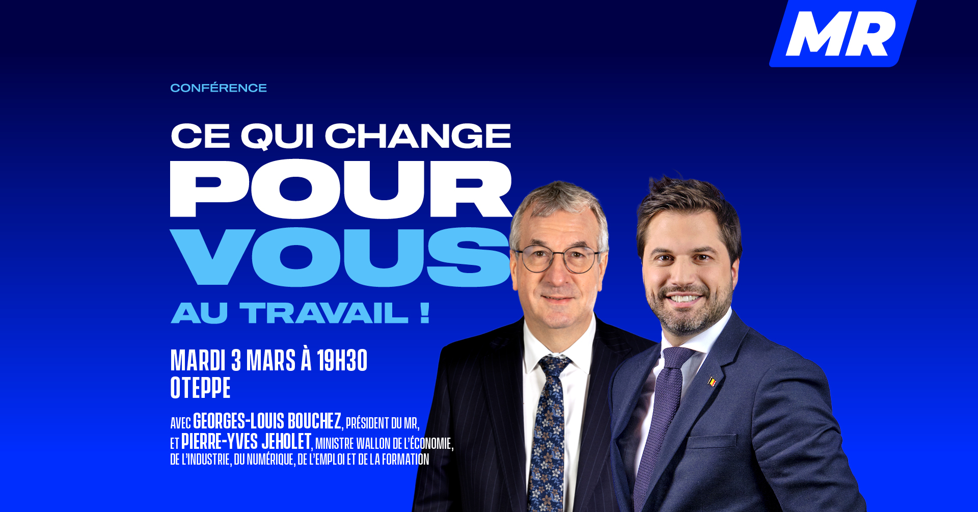 Notre président Georges-Louis Bouchez accompagné du ministre wallon de l’Emploi Pierre-Yves Jeholet vous expliqueront clairement comment clairement nos réformes et seront à votre disposition pour échanger sur les actions du gouvernement.